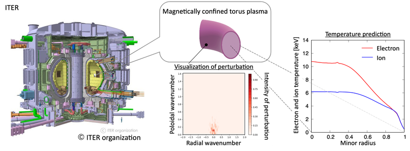 Figure (left) The magnetic fusion device ITER, (middle) Visualization of perturbation on the wavenumber space using numerical calculations. We have developed a machine learning model that analyzes the wavenumber space image. (right) The radial profile of temperature predicted by a machine learning model, which can predict temperature much faster than conventional ones.